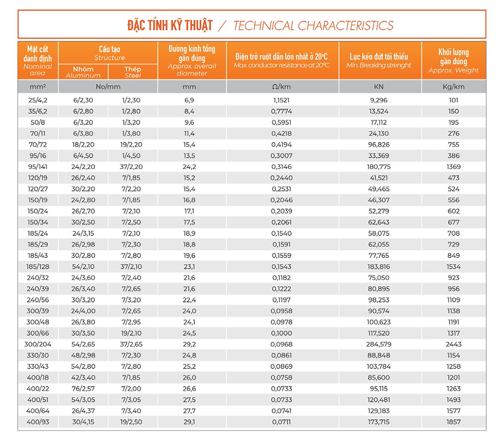 - Conductor: aluminum wire, concentrically stranded around a galvanized steel core.