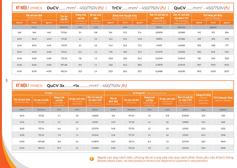 - TCVN 5064 – 1994; TCVN 5064 : 1994/SĐ 1 : 1995; TCVN 6610-3 / IEC 60227-3; TCVN 6612 / IEC 60228 or equivalent standard.