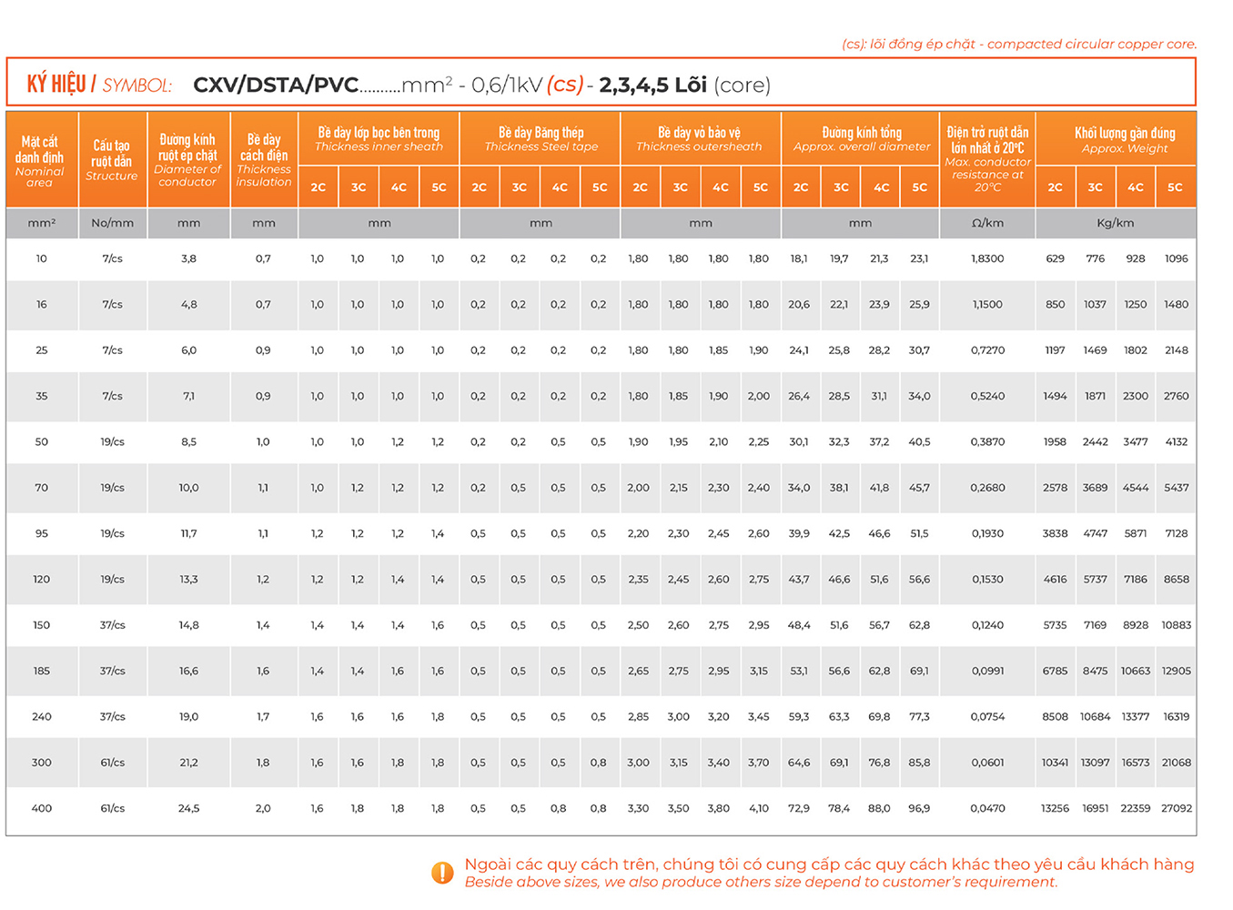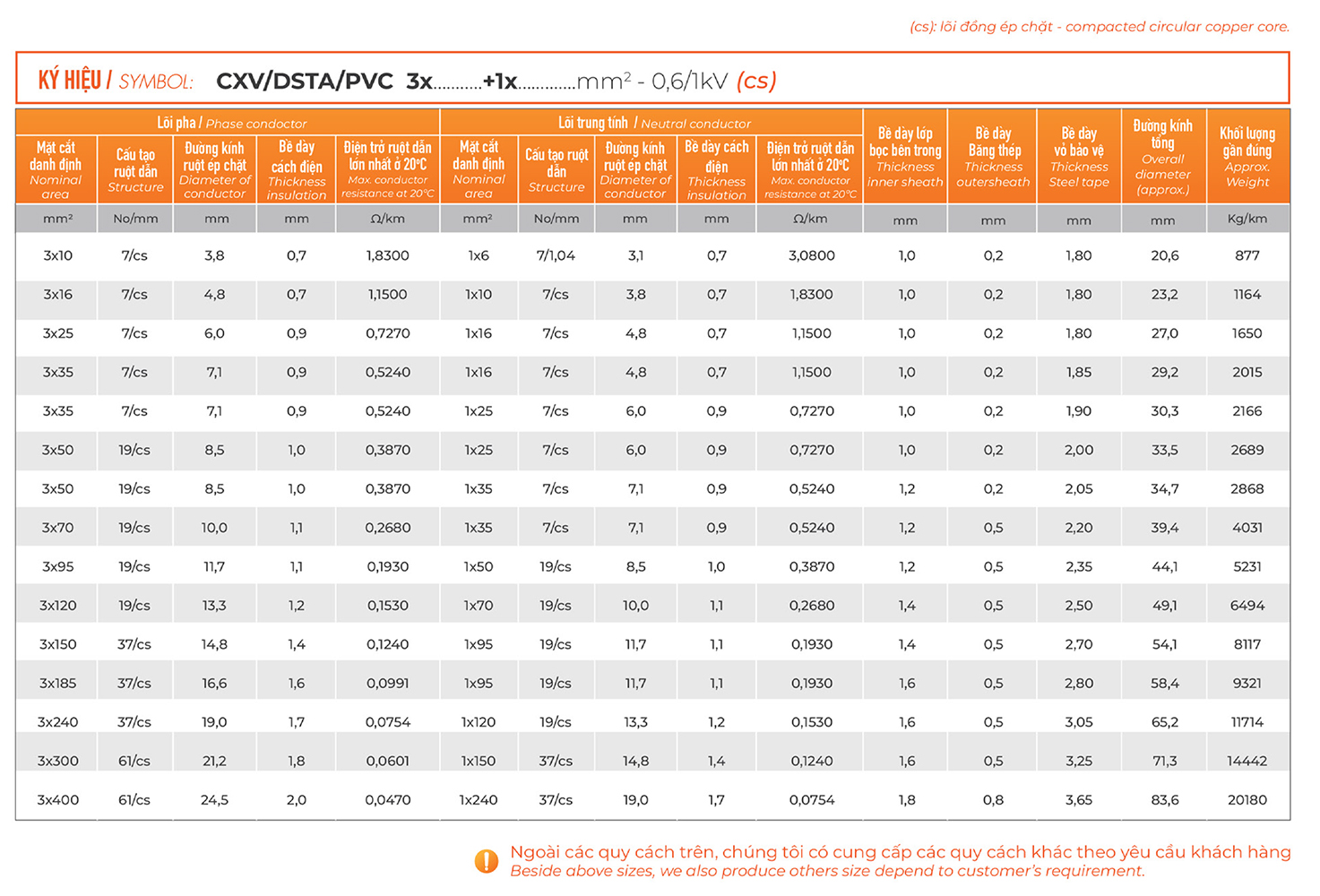 -CXV/DSTA/PVC…mm2 – 0,6/1KV (cs) 2, 3, 4, 5 lõi