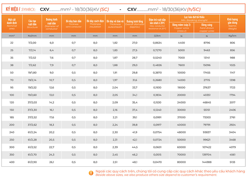 CXV…mm2 – 18/30(36)KV (SC), CXV…mm2 – 18/30(36)KV (h/SC)
