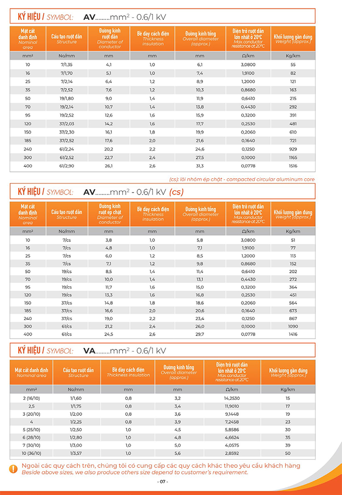 - TCVN 5935-1 / IEC 60502-1; TCVN 6612 / IEC 60228 or equivalent standard.