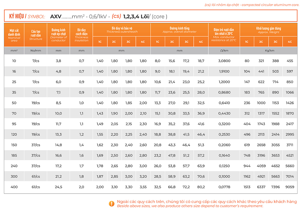 Symbol: AXV…mm2 – 0,6/1KV 1, 2, 3, 4 lõi; AXV…mm2 – 0,6/1KV (cs) 1, 2, 3, 4 lõi; AXV 3x…+1x…mm2 – 0,6/1KV; AXV 3x…+1x…mm2 – 0,6/1KV (cs)