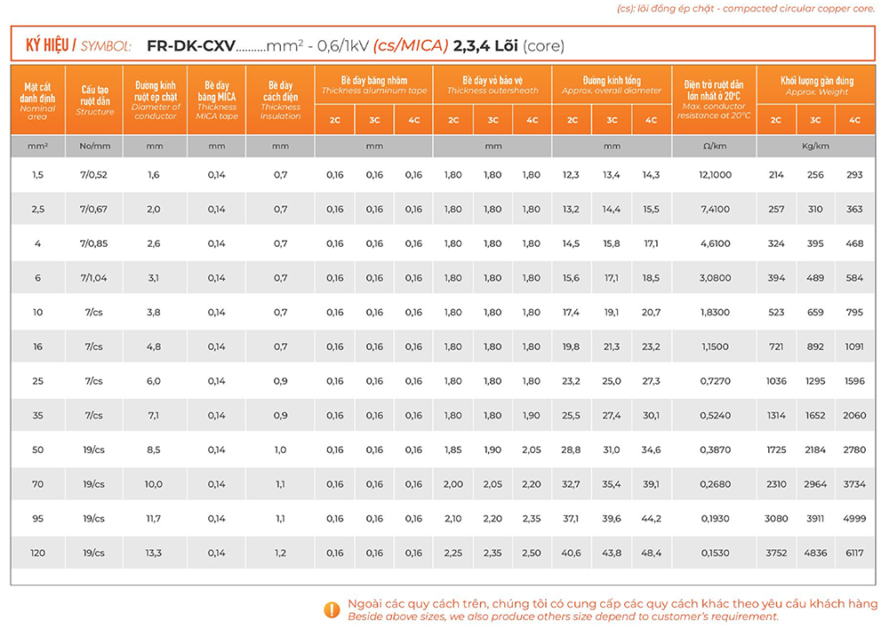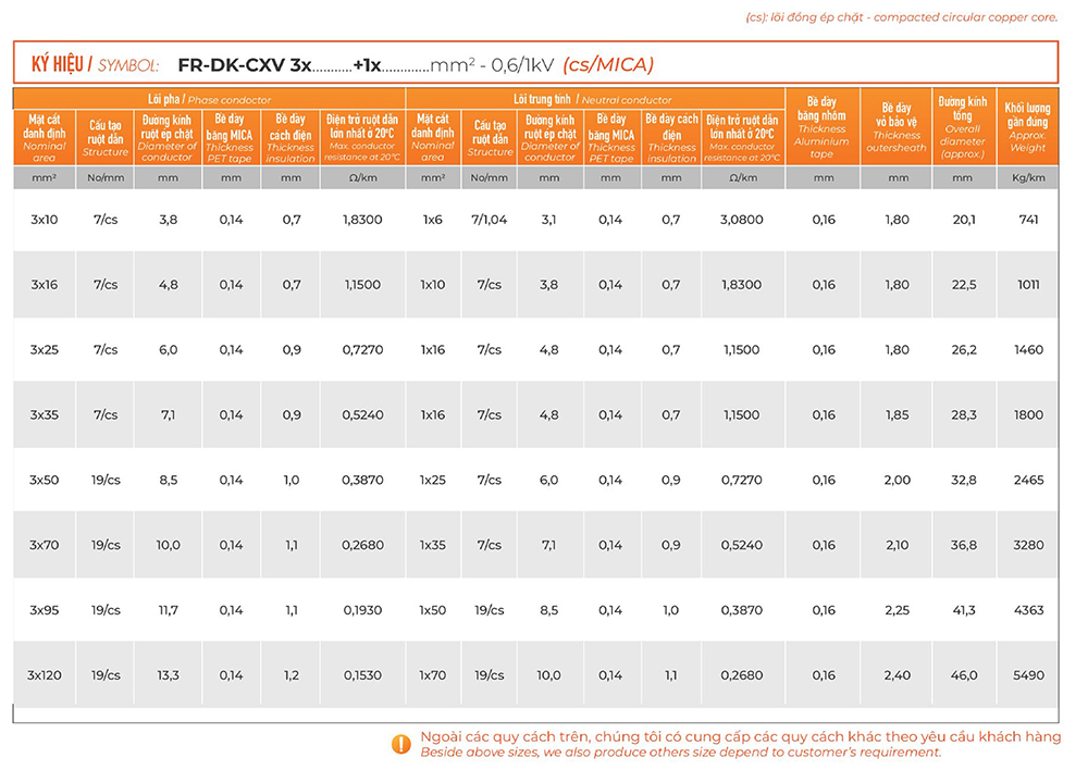 - Cấp điện áp U0/U: 0,6/1 kV.