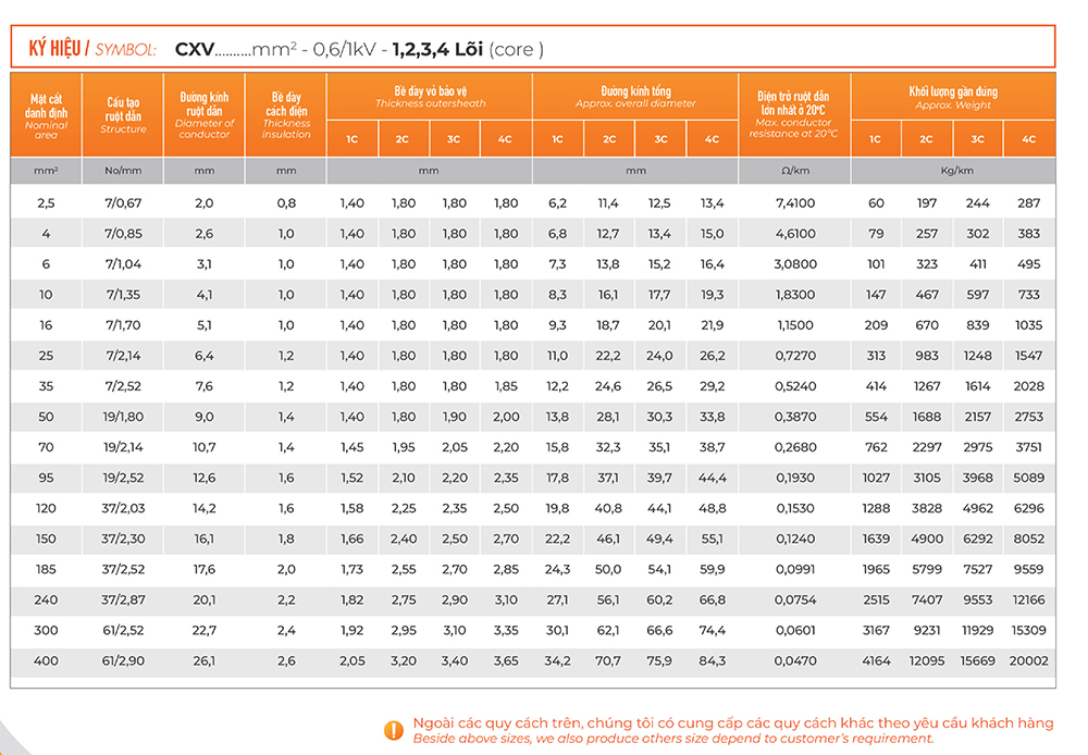 - Cấp điện áp U0/U: 0,6/1 kV.