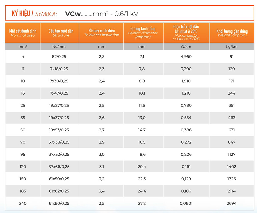 Ký hiệu: VCw… mm² – 0,6/1KV