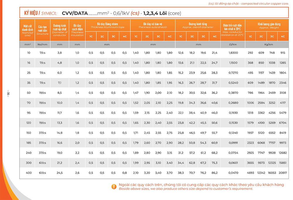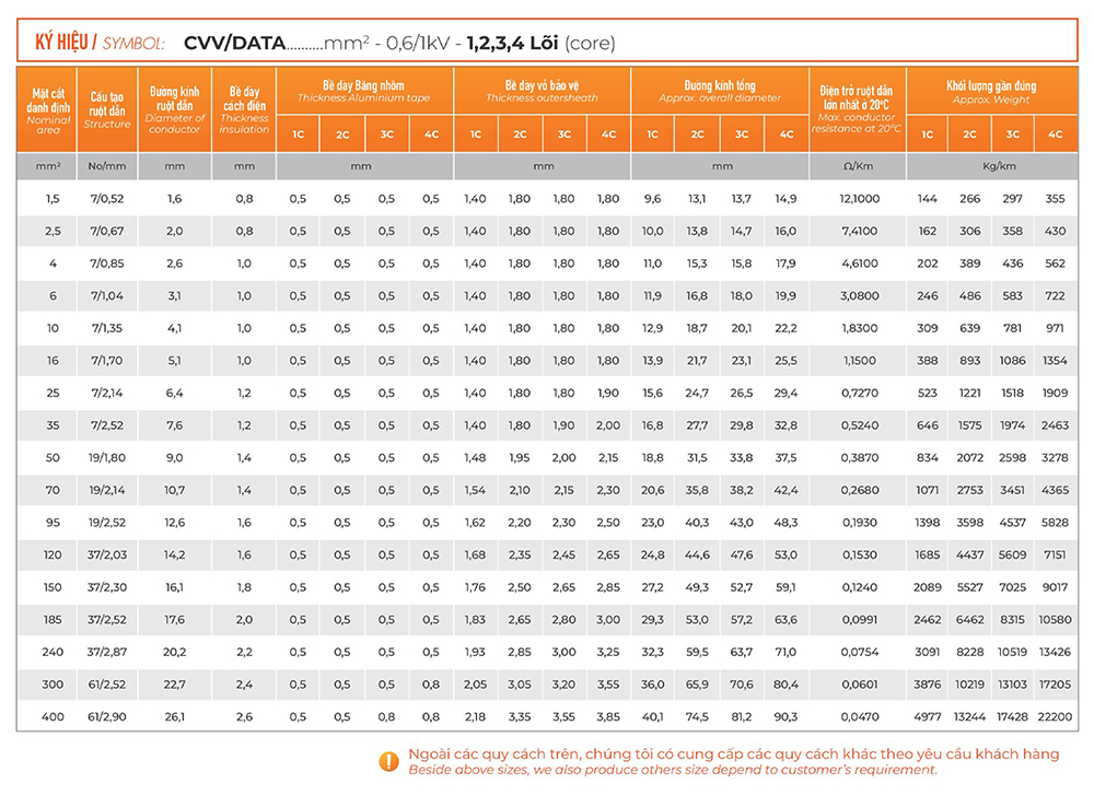 - – Cấp điện áp U0/U: 0,6/1 KV.