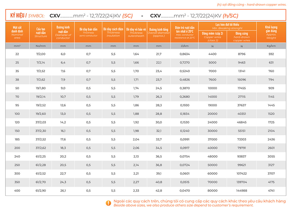 - Cấp điện áp U0/U(Um): 12,7/22(24) kV.